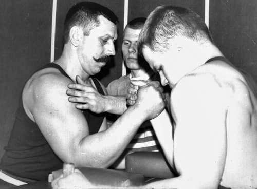 ![]() 9.02.1992 года. Политех. Родоначальник питерского армрестлинга Виктор Абаев (42 года) против Славы Ежова (17 лет) |